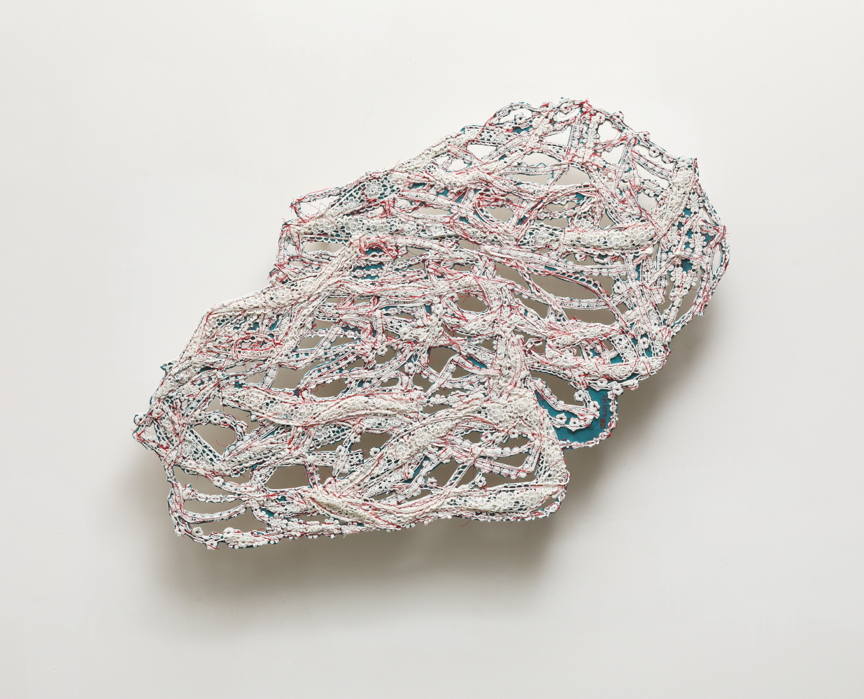이번 전시에 선보인 작품들 중 새로운 작업은 레이스 끈을 재봉해 만든 바위를 흰 벽 위에 띄운 비정형의 작품이다. 벽 위에 레이스 끈으로 만든 바위가 걸린 셈이다. 여기에 재봉된 레이스끈은 한지 위에 찍어 준법처럼 사용하던 끈의 실체이다. 한지에 끈을 찍어 표현한 바위에서 여백을 덜어내고, 색을 덜어내고. 묘사를 덜어내고 종국에는 실제의 레이스 끈과 그림자만 남았다. 어떻게 보면 가장 유연하고 부드러운 재료로 단단한 바위를 만든 것이다. 그렇게 만든 바위의 느낌은 부드러움일까 단단함일까?