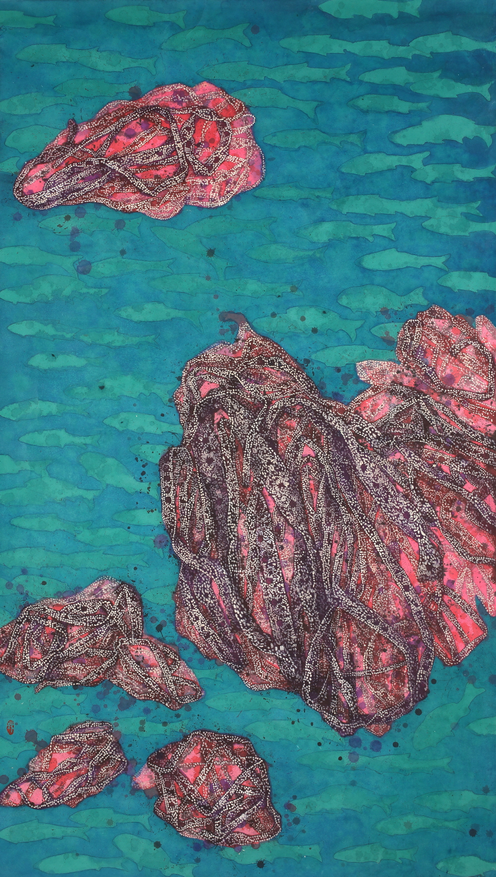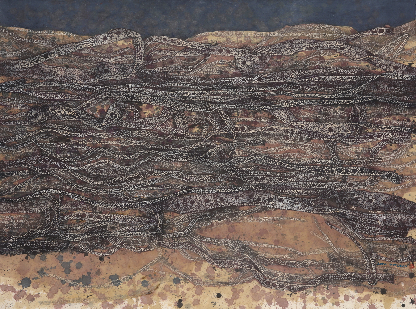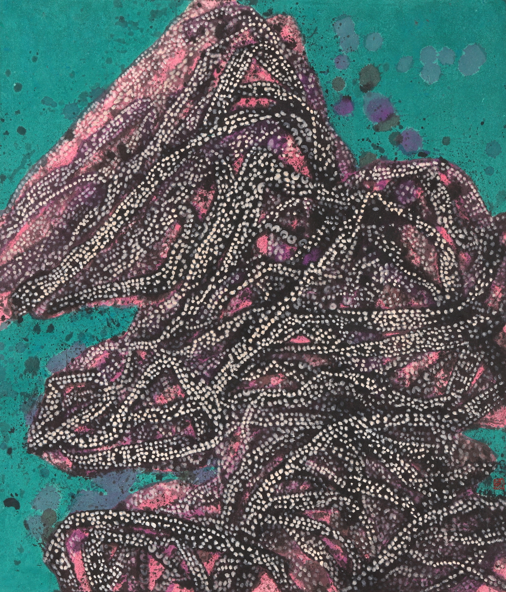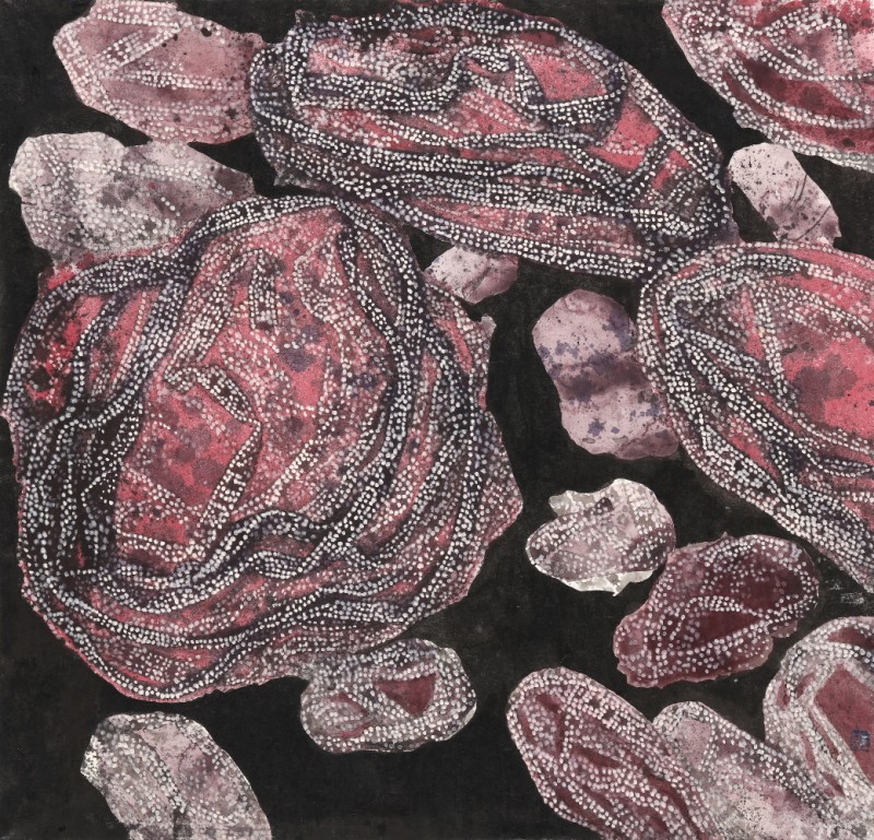 나는 한지 위에 먹물 묻힌 레이스 끈을 찍어 그 흔적을 겹쳐서 바위와 산을 그린다. 한지 위에 찍힌 레이스 끈의 흔적은 일종의 동양화 준법인 셈이다. 흔적은 흐느적거리며 쌓이고 쌓이며 단단해져서 바위가 된다. 그 위에 채색과 레이스 끈의 꼬임과 접힘을 강조하는 점들을 무수히 겹쳐 칠하고 찍으면서 바위와 산을 더욱 단단하게 만든다.