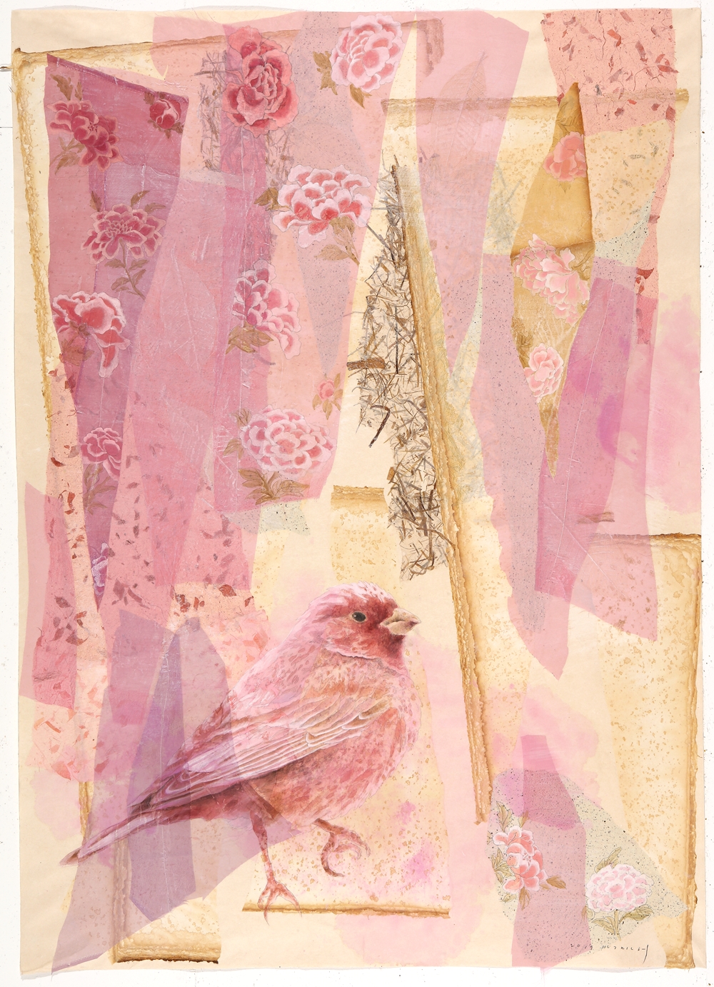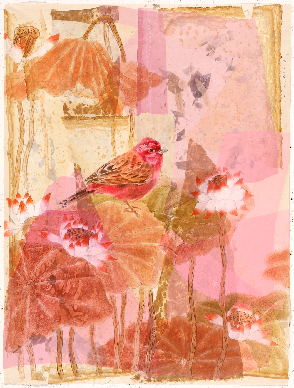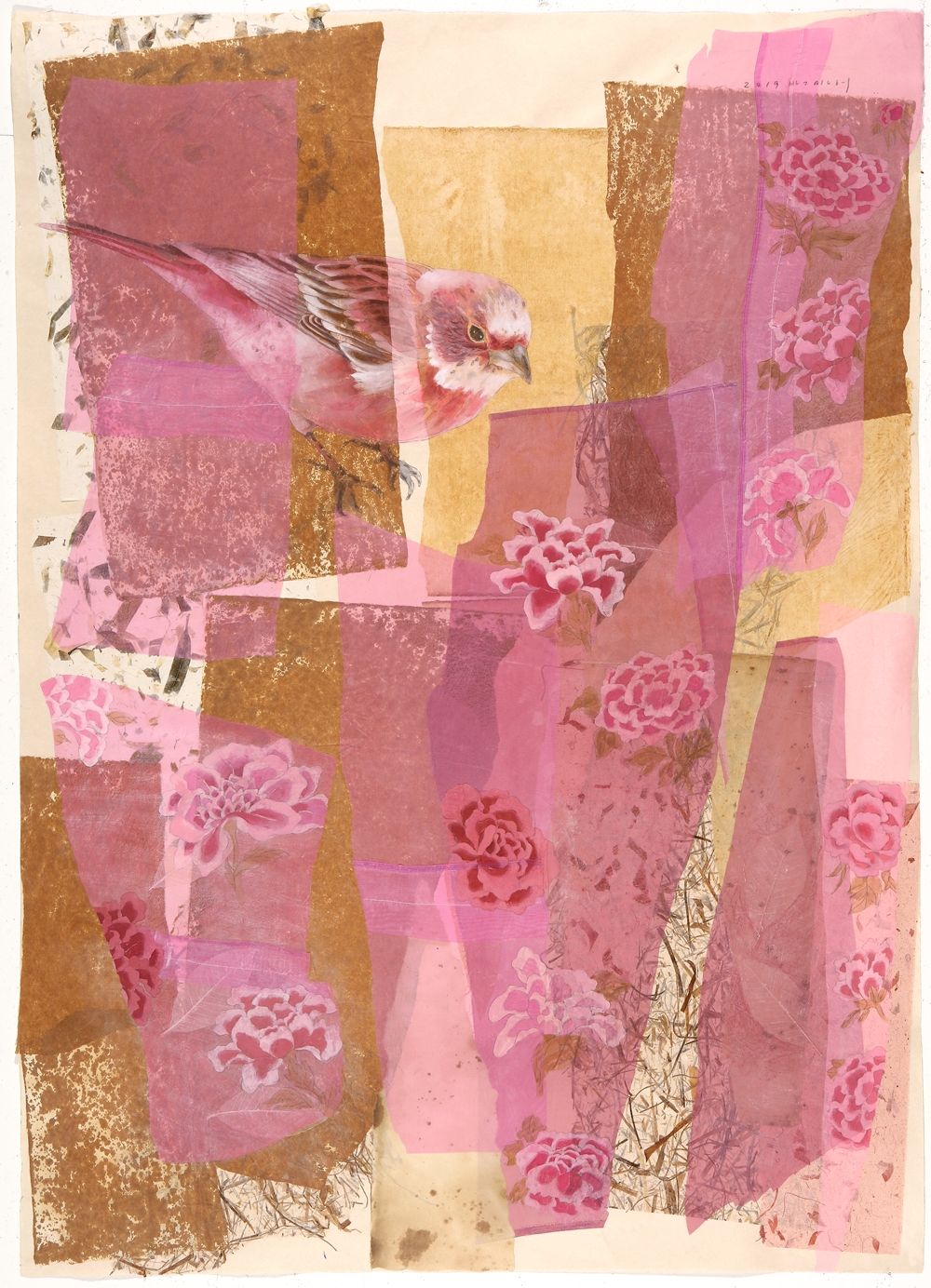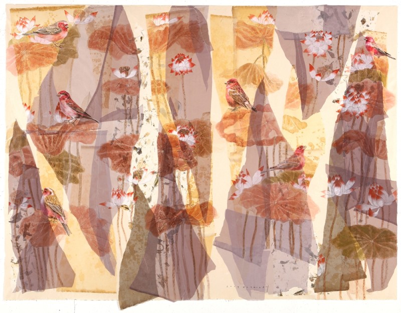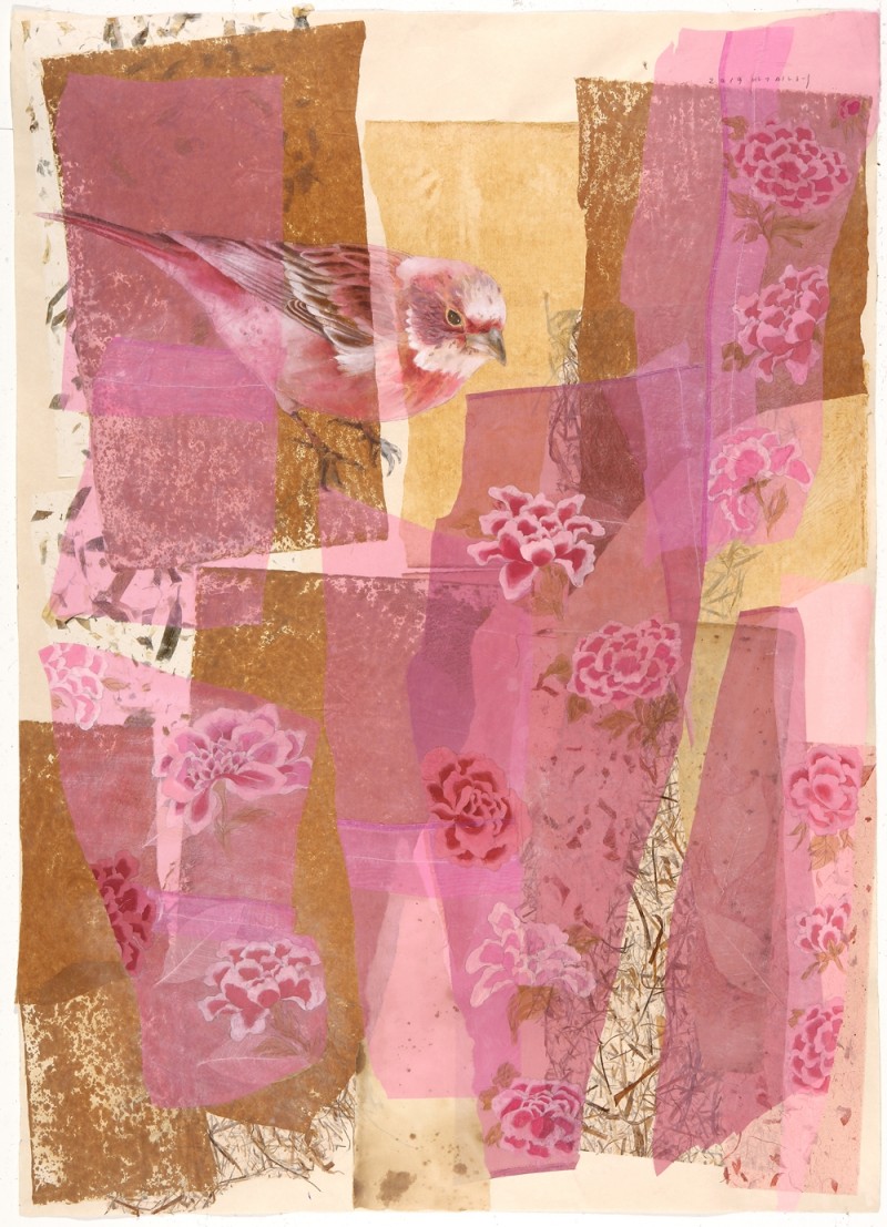그렇게 만들어진 크고 작은 조각들 위에 모란, 연꽃, 그리고 작은 새들이 만들어지고 또 그려진다. 수많은 기억의 층들과 더불어 내 안의 간절한 바람과 소망들이 서로 얽히고 겹쳐진다. 꽃 위에, 잎 위에 얌전히 앉아있는 물방울을 닮은 새는 나의 이런 바람을 담아 몇 번이고 고쳐지고 다듬어져서 비로소 모습을 드러내었다.
