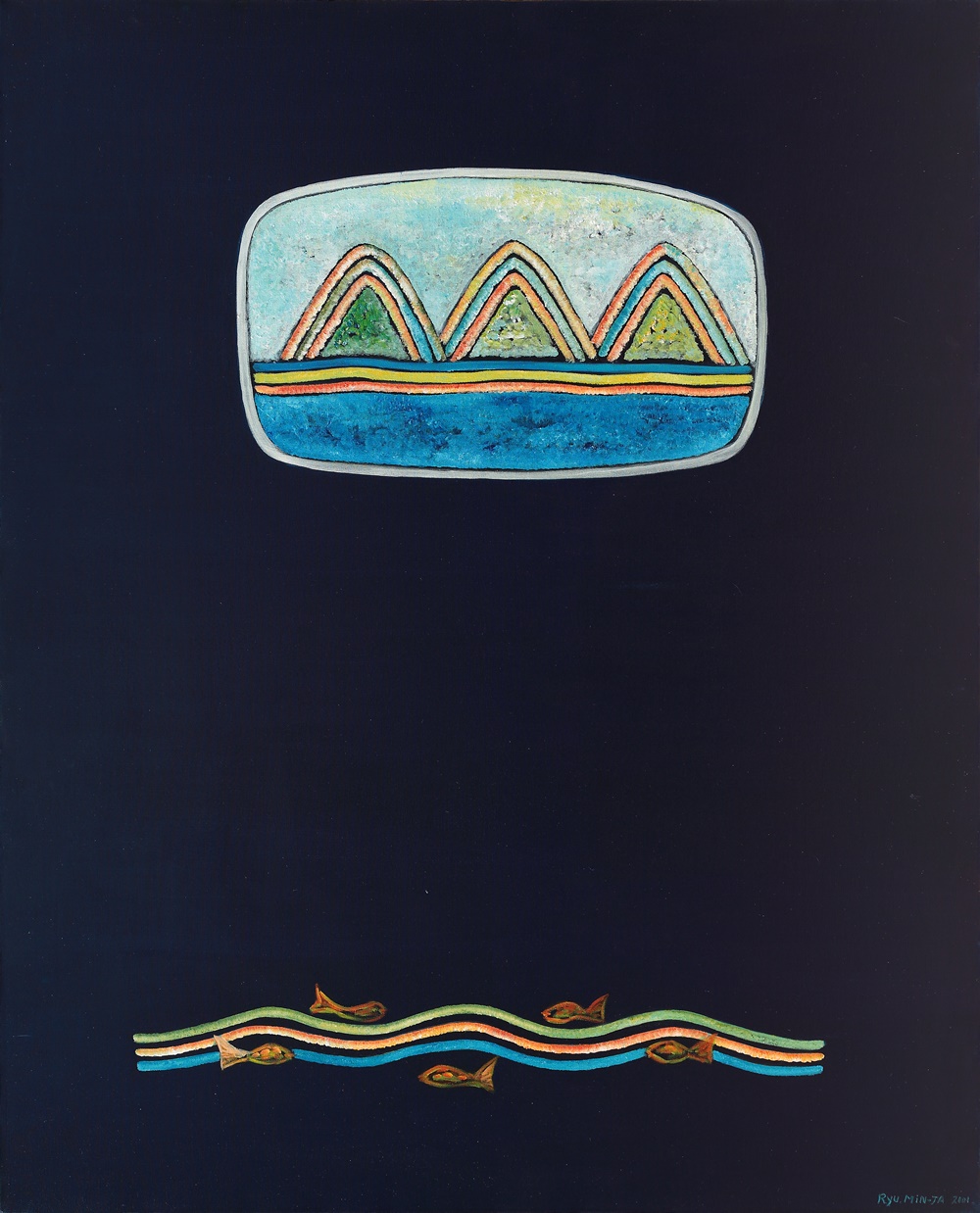 작가가 평생 추구해온 것은 결국 극락세계였다. 이른바 ‘평정심의 정토’였다. 그것들은 평범한 자연풍경 속에서, 추억 속 유년의 풍경 안에서, 한국인이 지닌 보편적인 경험의 자장 안에서도 마구 솟아난다. 그 추억의 형상과 색채들은 마음속에서 걸러내고 단축된 선과 색의 촘촘하고 복잡하게 얽힌 어울림 속에서 유기적으로 얽혀 빛을 발한다. 우리 한국인의 미의식의 지층에 깊숙하게 자리한 색채에 대한 감각의 지평을 거느리면서 출몰하는 그런 정토에의 도상화 작업이다. 그래서 작가가 즐겨 그리는 산과 바위, 달과 해, 사람 및 나무와 꽃, 집과 대나무 등은 한국인에게 매우 친숙한 도상이자 일정한 질서 속에서 순환을 거듭하는 것들이고 영원과 불멸, 이상적인 것들이기도 하다. 마치 십장생이나 민화, 불화, 혹은 우리네 옛 그림에서 흔히 접하는 풍경이 연상되기도 한다. 사계절의 변화와 시간의 찰나적인 흐름 속에서 소멸하는 것이자 동시에 거듭 환생하는 것들이며 한국인의 심상의 기억 속에 잠재된 원형으로서의 풍경, 공간이미지이자 극락이자 정토요 보살의 이미지에 다름 아니다.