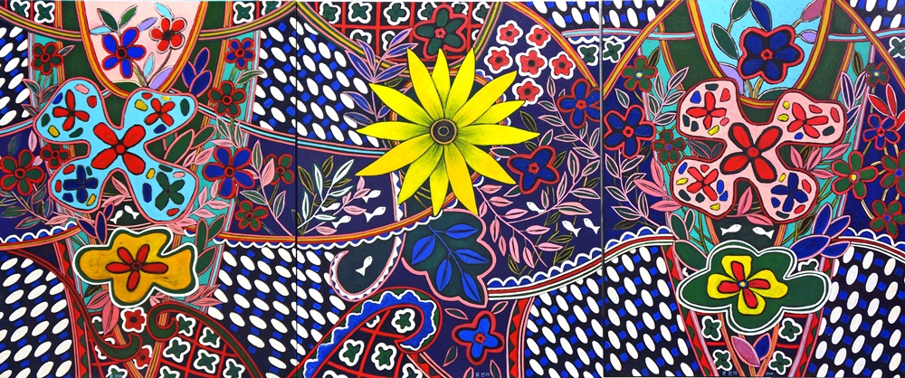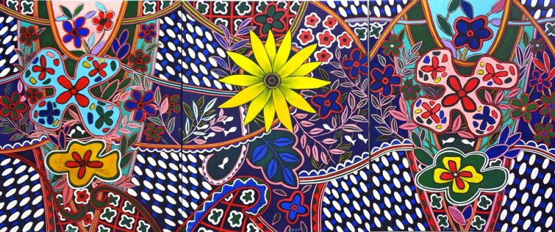 한지와 캔버스에 아크릴물감으로 이룬 다채로운 색채들은 마치 대나무 마디처럼 분절된 일정한 띠들이 특정 형상들을 그려나가거나 그 자체가 화면을 가득 채우고 있다. 작은 색 면들은 작은 조각들 하나하나가 전체 무늬를 이루었을 때 장식적인 의미를 갖게 되는 모자이크와도 같은 효과를 자아낸다. 색채의 조각들이 촘촘히 채워지거나 한 획이 절도 있고 분명한 선을 이루면서 지나간 자취들인데 그것들이 흡사 만다라나 단청, 꽃담, 색동 등을 두루 연상시켜준다. 대부분 단일한 한 가지 색이 칠해진 것이 아니라 여러 가지 색채들이 복합적으로 섞여 채워진 층이자 물감/색상들 간에 상호 겹치고 밀린 흔적이 고스란히 색으로 형성된 살의 촉감을 또한 일으켜 세워준다. 색은 여러 가지 색이 합쳐져 있을 때 비로소 자기 색을 더 발휘한다는 사실을 실감시키는 편이다.