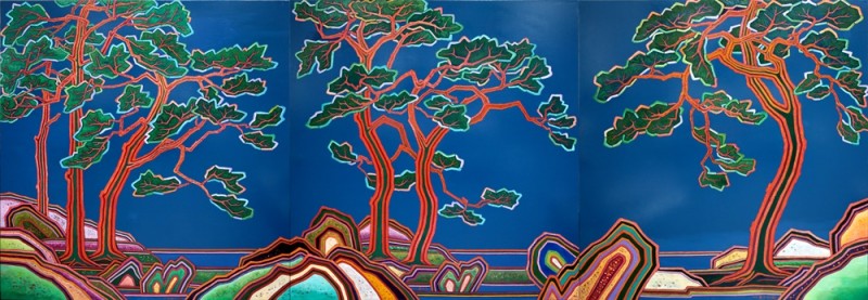 작가는 자신이 그리는 자연풍경이나 전통사회의 고향 풍경, 한국인이 이상적으로 떠올려주는 이상적 장소를 이른바 정토라 부르며 그곳에서 이른바 ‘보살의 상’을 발견한다. 정토란 ‘부처와 보살이 사는 곳으로, 번뇌의 구속에서 벗어난 아주 깨끗한 세상’인데 작가에게는 자연이 그렇고 추억어린 고향의 장소가 그러하며 삼라만상이 모두 그러한 맥락 안에서 순환한다고 보는 것 같다. 만다라란 기본적으로 우주를 상징하며 신들이 거할 수 있는 신성한 장소이자 우주의 힘이 응집되는 장소라고 볼 수 있을 텐데 작가는 분명 정신적으로 만다라의 중심으로 들어가 전진하고자 하는 차원에서의 그림을 시도하는 것 같다. 수많은 색과 선이 얽혀 있어 있고 특정 형상을 빌어 출몰하는 그림은 결국 작가의 만다라적 세계관이 투사된 조형어법에 근간해서 이루어지고 있다고 본다. 모든 살아있는 존재 안에서, 사물의 피부위에서 정토와 보살의 상을 발견하고 그곳에서 구원을 추구하는 마음의 극진한 상태를 추구하고 있는 것이 작가의 근작이라는 생각이다