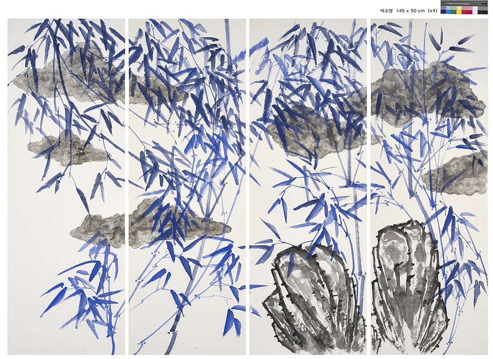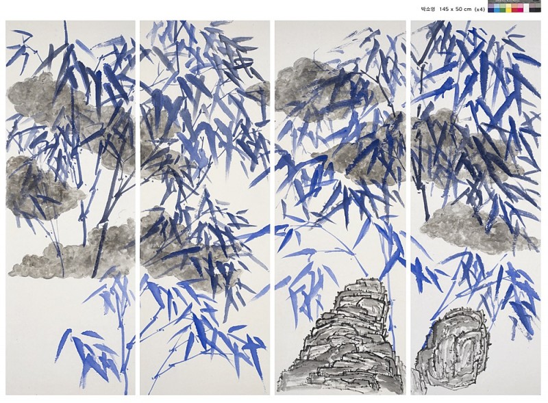 2018-11. 작품명: Stone, Bamboo and Clouds 크기: 145×200cm 재료: 캔버스에 수묵, 안료 제작년도: 2018
