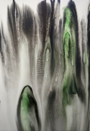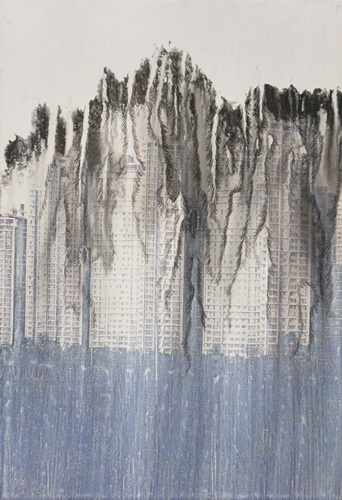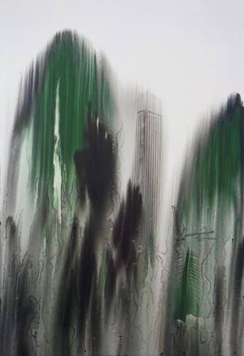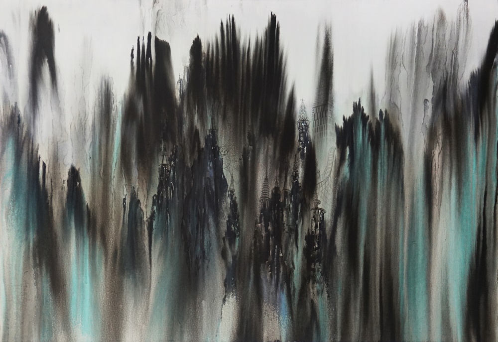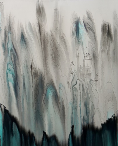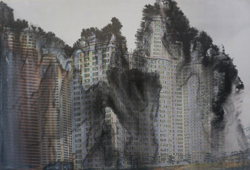 산수화는 단순히 산과 물을 그린 그림이 아니라 그 안에는 동양 철학과 사상이 고스란히 반영되어 있다. 오늘날 산수라는 개념은 그 의미가 많이 퇴색되었지만 달라진 시대와 삶의 환경 속에서도 그 안에 담긴 정신은 여전히 우리에게 의미가 있다. 특정 대상에 대한 태도에 국한된 것이 아니라 자신을 둘러싼 주변 세계에 대한 총체적인 인식을 보여주며 그것은 결국 만물의 조화로 이어지기 때문이다. 작가는 삶의 근원적인 장소인 자연을 어떻게 인식하고 그 안에서 나아가야 할 방향은 무엇인지에 대한 문제의식을 산수의 현대적 재해석을 통해 표현하고자 한다. 현대에 와서 자연이 머물렀던 자리는 산업화가 진행되고 수많은 건물, 빌딩, 도로들이 그 자리를 대신하고 있다. 근대화로 인한 도시가 발전된 만큼 커진 그늘은 인간의 소외감과 공허함을 불러일으킨다. 작가는 도시의 건축물을 주요 소재로 삼아 우리가 살고 있는 공간 즉, 일상생활 속에서 흔히 마주할 수 있는 인공적인 풍경을 전통적인 산수의 형상과 결합한다. 비슷한 외형의 건물들이 늘어선 삭막한 도시 풍경은 현대자본주의 논리에 충실한 사회의 일면을 보여준다. 부를 대변하는 물질적인 의미로 바뀌어버린 건축물은 끝없는 인간의 욕망과 맞물려 비정상적으로 높거나 집적된 형태로 나타난다. 재료의 성질에 따른 우연성이 만들어낸 여백과 구도는 작품의 표현에 있어서 중요한 조형요소로 작용한다. 위에서 아래로 자연스럽게 번진 먹의 흔적이 만들어내는 수직적인 형태를 기반으로 상상하고 그 위에 다양한 건축물을 표현한다. 추상과 구상의 경계를 넘나들며 노골적으로 주제를 드러내기보다는 동양화가 지닌 수묵의 번짐과 스며듦의 특성을 살려 변화있고 깊이있는 화면을 먼저 이끌어내도록 노력한다. 건축물과 함께 겹쳐진 산수의 형상은 자연을 동경하는 우리 이면의 모습을 대변하고 있으며 다양한 층위로 구성된 이미지들은 시공간을 초월하여 도시와 자연, 인간의 부조화에 대한 사회의식을 담아낸다.
