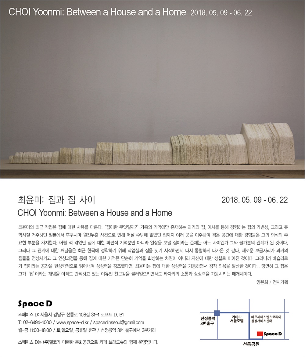 집과 집 사이 최윤미展 / CHOIYOONMI / 崔允美 / installation 2018_0509 ▶ 2018_0622 / 주말,공휴일 휴관 스페이스 D SPACE D 서울 강남구 선릉로108길 31-1 로프트 D B1Tel. +82.(0)2.6494.1000/+82.(0)2.508.8400www.space-d.kr