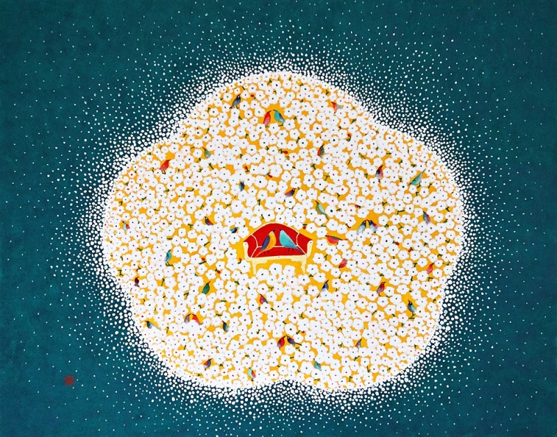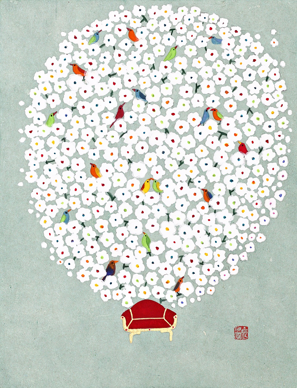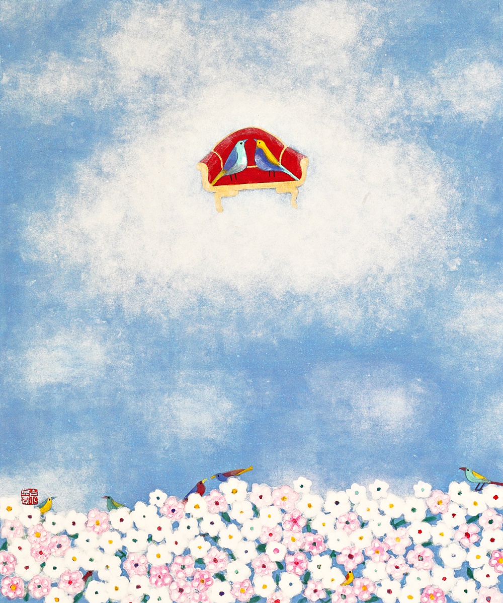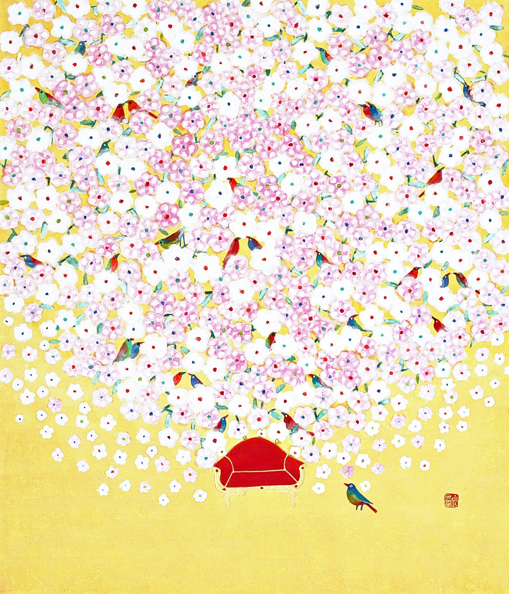 작품 속 새의 형상은 제각기 다른 모습으로 표출된다. 여러 감정을 노래하듯 그네들의 시선은 때론 경쾌한 때론 경건한 멜로디가 되어 마음을 움직인다. 크지 않은 작은 화단, 흰 꽃이 모여 조용히 빛을 내는 작은 공간 사이에서 꽃과 새는 동일한 크기로 만나 삶의 단면을 노래한다. 그 모습은 어떤 구속도 없는 자유로운 세계를 담았다. 걸리는 것도, 집착하는 법도 없다. 이 꽃에 앉았다가 다른 꽃으로 이동하는 자유로움 속에서 작가는 무엇 하나 자유로울 수 없는 우리네 삶을 위로하고자 한다. 초창기의 새는 딱딱하고 날카롭고 왜곡된 의식화된 새의 형상이었다. 40대 초반 다시 시작한 작업에 대한 갈망은 오로지 배워야겠다는 의지로 채워져 있었다. 기존체제의 답습과 수묵담채식 추상작업으로부터의 탈피는 ‘왜곡된 형상의 새’로 현실화 되었다. 무거운 현실과 삶의 숙제들은 야생화를 발견한 시기와 맞물려 조금씩 벗어나기 시작했다. 이른바 자기화된 작업의지는 세상을 향한 관심 전체를 변화시켰다. 칸딘스키가 자신의 뒤집어진 작품에서 깨달음을 얻었던 것처럼 생각의 전이는 창밖의 소리로부터 찾아들었다. 원래 살던 곳에서 느끼지 못했던 공기와 자연을 느끼기 시작하면서, 상큼한 향기와 같은 새의 지저귐이 작가의 마음에 내려앉았다. 하지만 그 안에서 실제 새는 발견되지 않았다. 육체적·정신적으로 힘들던 시기, 예견 없이 찾아온 새의 지저귐은 맑고 몽롱한 내면의 소리가 되어 작품으로 승화된 것이다. 현실과 맞닿은 이상화된 세계 최근 작업에서는 기존 작업에서 볼 수 없던 두 가지 요소가 가미되었다. 첫째는 개별적으로 흩어져 있던 꽃이 통일감 있는 하나의 형상을 이루었다는 것이다. 의인화된 문인의 시각을 현대화된 음율(새가 시를 읊조리는 느낌)로 표방한 느낌이다. 색감 역시 전통 오방색(五方色)을 현대화시킨 모습으로 재해석 되었다. 공허하고 슬프다는 것은 참고 살아온 인생이었음을 반증한다. 작가는 2014년의 개념화된 <추억의 정원>시리즈에서 지우고 지워내는 작업을 보여준 바 있다. 기존 작업이 슬픈 정서를 녹여냈다면, 현재 작업은 기쁘고 유려하다. 작가는 유년시절 집에 놓여 있던 모란꽃 장신구들과 앞마당에 피어있던 작약의 화려함을 기억해냈다. 하나의 꽃으로 형상화된 작은 꽃의 세계는 견뎌온 세월을 향한 긍정적인 보상을 의미한다. 그래선지 작품은 미세한 부분까지 작가의 마음을 녹여낸다. 들꽃(야생화)에서 매화로, 좀 더 화려한 꽃으로, 앞으로 작가는 삶을 변화시키고자 하는 의지를 꽃의 변화상을 통해 드러낼 것이다. 둘째는 작품 안에 일종의 데페이즈망(dépaysement; 전치(轉置), 전위)이 사용된다는 점이다. 왕좌(王座)를 떠올리는 화려한 의자 위에 새들은 다채로운 모습으로 내려앉아 화면 속 꽃의 세계를 바라본다. 화려한 의자가 등장했다는 것은 왕의 귀환과 같이 ‘가장 아름다운 시절(La belle époque)’을 요청하는 동시에, 휴식 같은 여유를 취하고자 하는 결연한 의지를 보여주는 것이다. 시인 로트레아몽(Lautréamont)은 꽃·새·의자 등을 표현한 초현실적 기법에 대해 ‘재봉틀·박쥐·우산과 같은 전혀 관계없는 물체들이 해부대 위에서 우연히 만난 듯한 아름다움’이라고 표현한 바 있다. 낯익은 물체를 일상적인 질서에서 떼어내 이처럼 뜻하지 않은 장소에 놓는 행위, 바로 이러한 우연성은 달리의 시계처럼 우리의 시·공간을 경이와 신비에 가득찬 무의식의 세계로 인도한다. 작가의 마음 속 깊이 잠재해 있던 무의식의 세계를 해방시키는 창구, 의자는 우리에게 다른 삶으로 인도하는 하나의 탈출구인 셈이다. “그림을 그리는 과정은 나 자신을 발견해가는 과정이었습니다. 작품을 하면서 위안을 받았던 것처럼, 내 그림을 보는 사람들이 작품 속 의자 안에서 편히 쉬어 갈 수 있기를 바랍니다.” - 작가노트 중에서