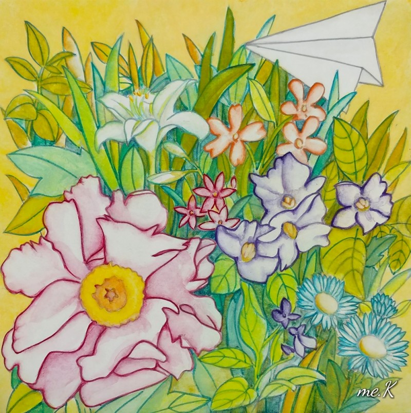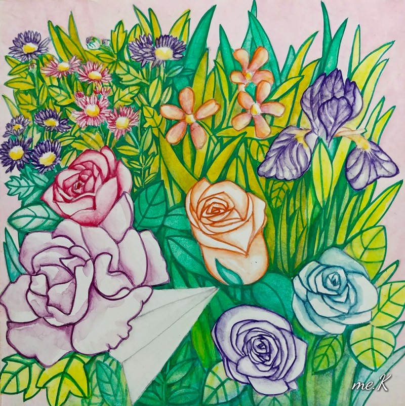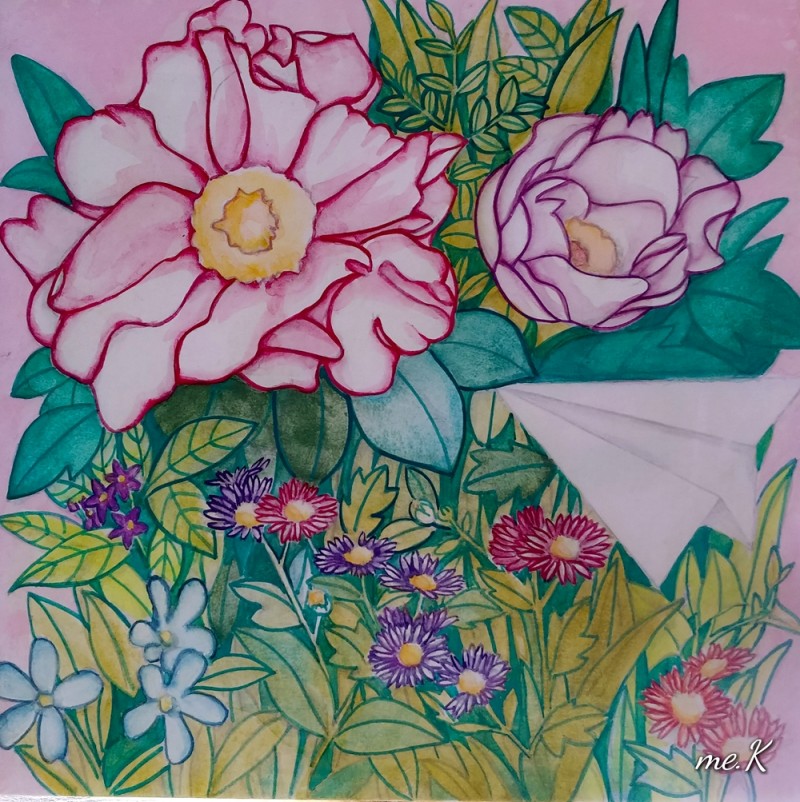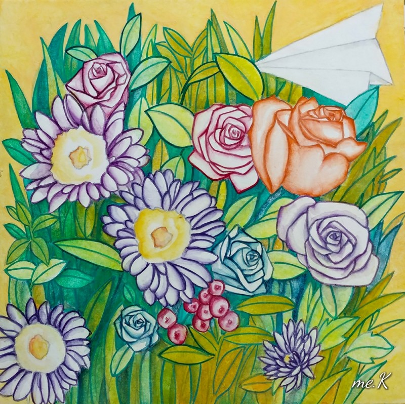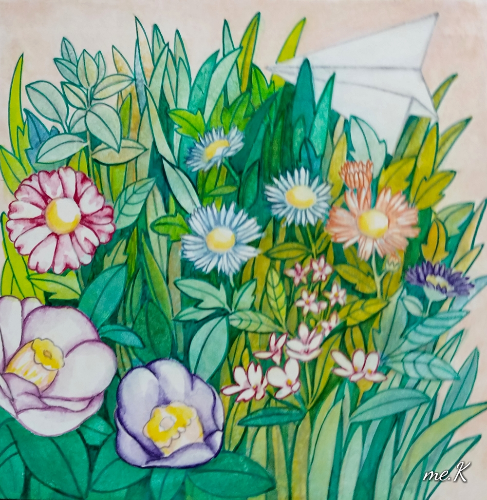 작품의 모티브는 민화의 화접도에서 가져왔으며 꽃과 나비대신, 종이비행기로 표현한 작품입니다. 작품은 분채와 한지를 이용하여 진채기법으로 생동감과 한국적인 아름다움을 표현하였습니다. 또한 꽃과 풀이 흐드러지게 밀집되어 에너지가 느껴지는 구도를 중요시 했습니다. 옛 선인들이 그림에 소망을 담은 의미처럼 꽃은 자연, 힐링의 의미와 종이 비행기는 현대 사람들의 화합, 기쁨, 사랑, 행복, 부귀를 상징합니다. “꽃 흐드러지다”에서 꽃과 비행기는 나의 경험적인 어릴적 추억, 길을 가다 보고 느꼈던 주관적 꽃을 의미하기도 합니다. 우리가 자연을 통해 느끼는 어떤 세계도 나에게 경험되지 않는 한, 어떤 독립적 존재 성격도 갖지 못할 수도 있습니다. 나에 관계함으로써 비로소 존재할 수 있는 것으로 설명될 수 있기 때문입니다. 나에게 지각되어 나의 관념으로 환원되지 않는 한, 버클리의 ‘주관적 관념론’(subjective idealism)에서도 이야기 하고 있듯이 하나의 ‘꽃’이란 관념은 그 꽃에 대해 지각된 내용의 다발에 한갓 ‘꽃’이란 이름을 붙인 것에 지나지 않습니다. 즉, 우리와 관계하고 감성적으로 느껴야 의미가 있다고 생각하고 있기 때문입니다. “꽃 흐드러지다”는 작가의 주관적 의미의 자연을 그린 전시입니다. 바쁘게 돌아가는 도시속의 우리는 자연과 멀어져 갔습니다. 자연의 감성을 잃어가는 현대인들의 삶을 돌아보고 자연의 에너지를 느꼈으면 합니다.