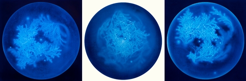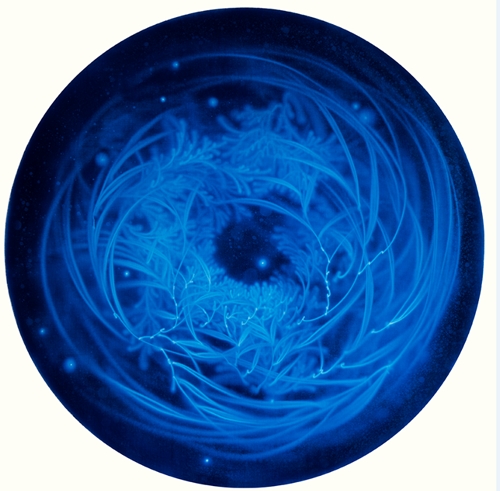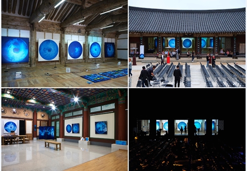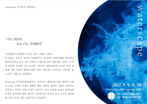 "이수관지以水觀之란 물로써 세상을 바라보다" 는 송창애의 예술세계를 관통하는 핵심사상이다. 물은 모든 작품의 소재이자 주된 표현기법, 그리고 그 안에 함축된 의미를 담는 하나의 그릇이다. ‘워터스케이프 waterscape’ 시리즈는 '물로 그린 물 그림'으로 물이라는 메타포를 통한 생명의 근원과 본질, 그리고 존재의 원형에 대한 직관적, 감각적 경험의 산물이다. 흐르는 물을 분사하여 화면의 바탕색을 지우고 씻어내는 방식으로 형상을 만드는 '물 드로잉 water drawing' 기법은 송창애 작가만의 맑고 투명한 독자적 조형세계의 근간이다. ‘허虛’를 중시하는 동양사상에 바탕을 둔 이러한 조형어법은 수아일체水我一體에 의한 허실상생虛實相生의 현대적인 조형적 구현이라 할 수 있다. ‘Waterscape_무가보주無價寶珠’는 우리 모두가 태어날 때 지니고 있는 보배구슬을 은유한다. 적막하고 짙푸른 심해 속에서 피어오르는 맑고 영롱한 물꽃은 불완전한 존재의 완전성에 대한 원초적 그리움이자 본성회귀에 대한 표상이다. ‘Isugwanji (以水觀之)’, which means ‘Looking at the world through water’, is a core idea that passes through the entire artworks of Chang-Ae Song. Water is not only a material for all her works, but also a creative expression technique. Furthermore, water is a vessel containing her conceptual and emotional implications in it. Since her artworks are drawings with a material of water, her waterscape series is a product of intuitive and sensory experience of the origin and nature of life for her, which envisions the prototype of existence through the metaphor of water. Her expression technique called 'water drawing', is creative since she creates images by directly spraying flowing water to erase and wash the background color. It is the basis of her original artworks since this formative method is based on the oriental philosophy, which emphasizes 'Huh(虛)' which means empty space in mind, space, and time. With her own original expression technique, she intends to express this oriental philosophy as a modern formative realization of traditional concept. 'Waterscape_ Mugaboju (無價寶珠)' is a metaphor for the intrinsic value of each of us as we are born. Therefore, her artworks symbolize the primitive nostalgia for human nature that craves the perfectiveness of human beings by expressing water flowers that blossoms in deep oceans. |