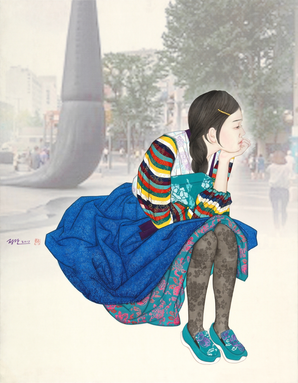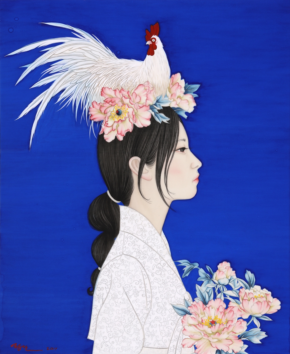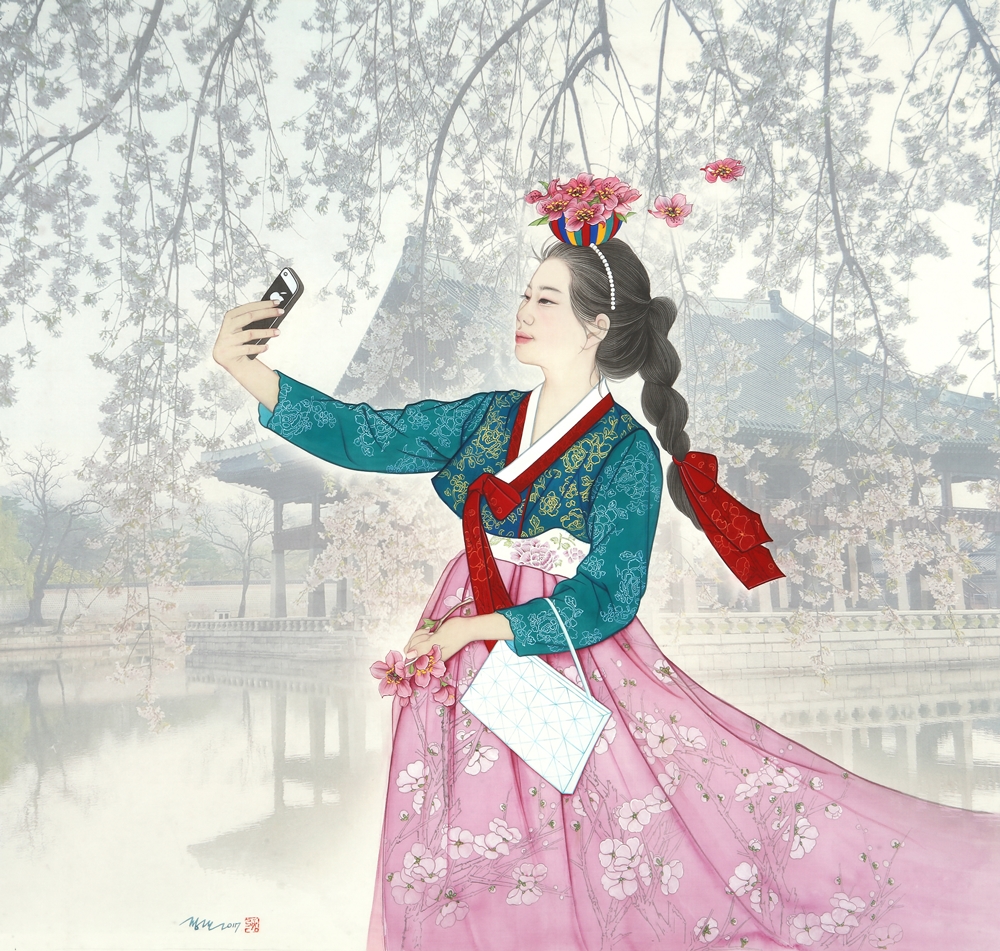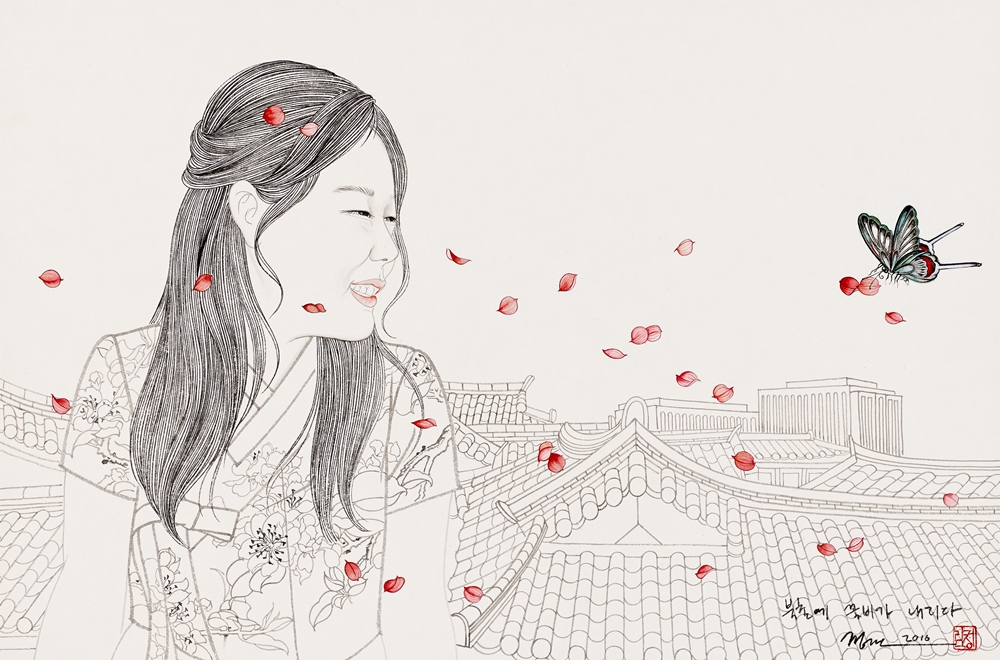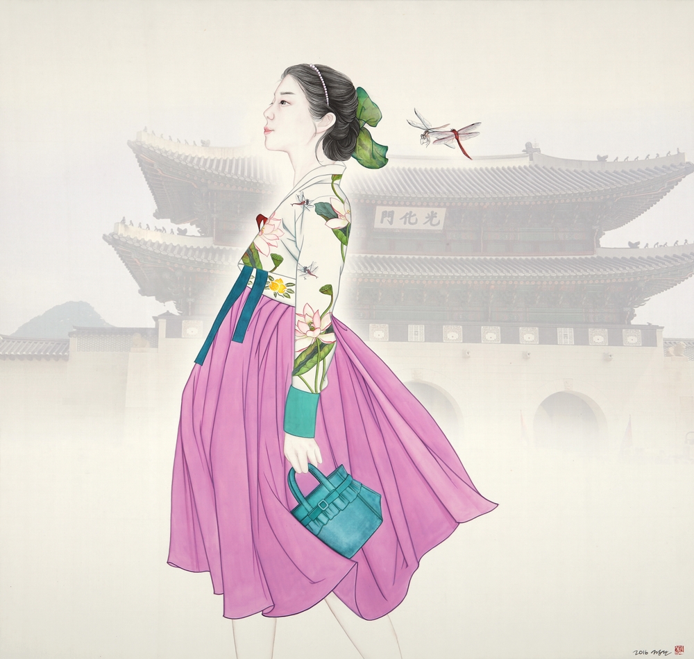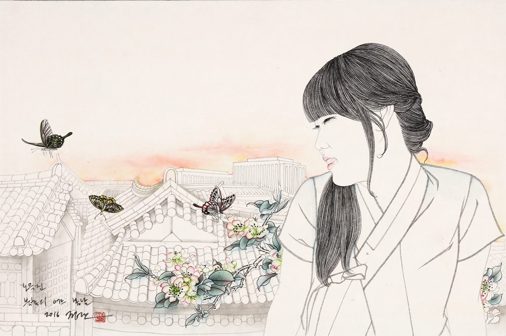 작가노트 바야흐로 한류의 시대이다. 대중문화에서부터 그 유행을 주도해 오던 한류는 이제 한국의 문화와 전통까지 관심의 대상이 되고 있다. 이러한 가운데 한국 전통의 매체와 필법으로 작업을 지속해오고 있는 나에게 한류는 또 다른 작업의 모티브로 의미를 제공하고 있다. 한국의 전통의상을 입고 있는 여성의 초상화 ‘21세기 미인도’와 동자승을 비롯한 어린이 그림은 그림에서 전통적인 방식의 인물 표현 뿐 아니라 서울이라는 장소성까지 구현하게 되었다. 서울은 우리나라 역사상 중요한 장소이다. 조선왕조 오백년을 이어 지금까지 우리나라의 수도로 자리를 차지하고 있는 서울은 현대화된 도시이기도 하지만 문화와 역사가 고스란히 남아있는 곳이기도 하다. 특히 최근 몇 년간 주목받고 있는 인사동을 위시한 광화문 일대는 그동안 나의 작품에 등장해 오고 있는 인물들과 자연스러운 조화를 이룰 수 있었다. 전통가옥과 전통의상, 한국을 대표하는 두 컨텐츠를 하나의 화폭에 담아 첨단화되어가고 있는 이 시대에 고즈넉한 옛 문화를 돌아보고자 한다. 첨단화와 전통이라는 방식은 작품의 표현방식이기도 하다. 사진 이미지가 난무하는 이 시대에 손으로 인물을 사실적으로 표현한다는 것은 어찌 보면 미련해 보일수도 있고 어찌 보면 장인정신을 필요로 하는 작업이다. 손쉽고 스피드한 것을 추구하는 세상과 맞서 한 땀 한 땀 그려가는 인물과 빠르게 이미지를 얻을 수 있는 사진이라는 두 가지 매체와 포토샵 프로그램을 이용한 배경 작업은 이질적이기도 하지만 서로 조화를 이루며 하나의 작품을 만들 낸다. 이것은 어쩌면 전통과 현대가 공존하는 이 세대의 모습이기도 할 것이다. 이번 작품들은 너무나 한국적인 이 두 가지 컨텐츠인 한옥과 한복의 모티브를 통해 많은 사람들이 우리의 것을 더욱 자랑스럽고 소중히 생각해 주었으면 하는 바람과, 사진의 이미지가 난무한 이 시대에 전통의 방식으로 그림을 그린다는 것의 의미가 무엇인지에 대한 나의 고민이다.