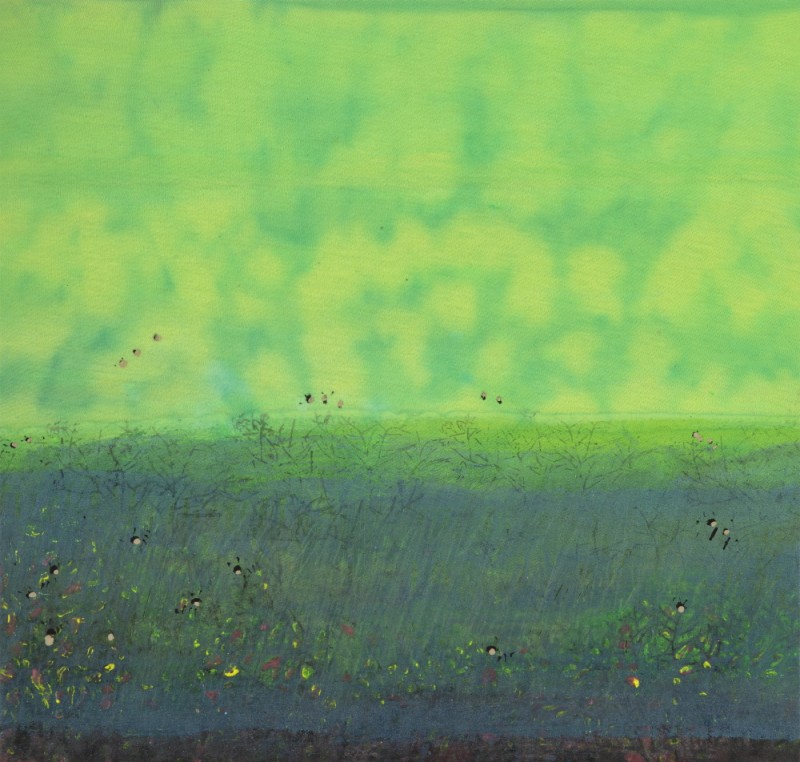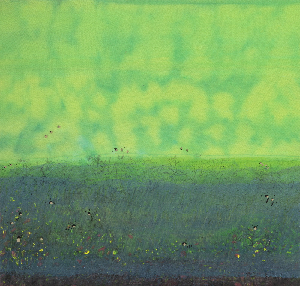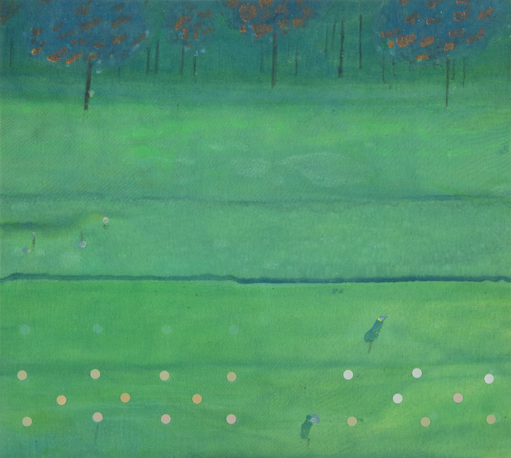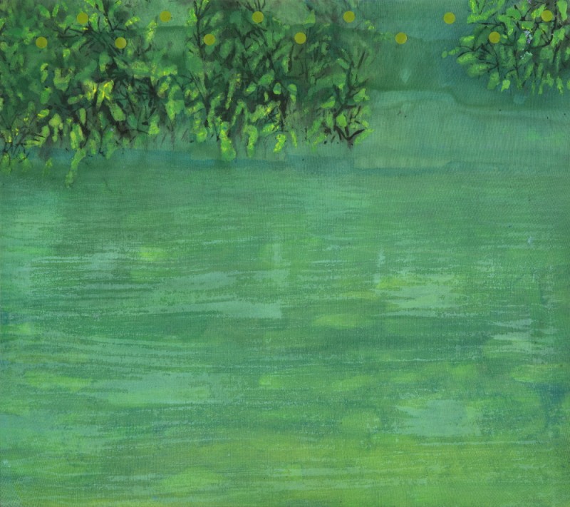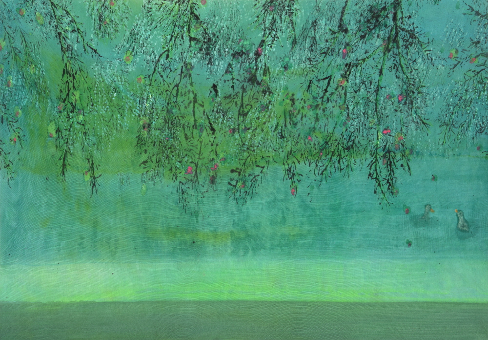 실제 그림을 보면, 물안개가 피어오르는 강변에 오리 몇 마리가 노닐고, 나뭇가지에 앉은 새가 미동도 없이 고즈넉하다. 과수밭 혹은 풀밭 혹은 들판 건너편으로 강이 흐르고, 수평선 위로 하늘이 내려앉은, 때로 하늘 위로 빗방울이 사선을 그리며 떨어지는 풍경도 있다. 멀리 엄마(지모)의 품처럼 숲을 감싸고 있는 산이 보이고, 강변에 비친 나무의 물그림자가 일렁이고, 물속으로 바닥의 표면 질감이 보인다. 그 숲속, 그 강변의 어스름한 그림자 속 어디쯤인가에는 아마도 벌이며 나비가 날고, 송충이며 뱀도 살고 있을 것이다. 생태적 풍경이라고 해야 할까. 내가 모르는, 내 인식이 미처 가닿지 못하는 순간에도 생태는 치열하게 저마다 자신의 삶을 살고 있을, 그 실체가 손에 잡힌다기보다는, 정황적이고 암시적인 풍경이다. 사물 대상과의 거리를 유지하면서 서로 스며드는 관조적인 풍경이다. 아득하고 아련한, 부드럽고 우호적인, 마치 시간이 멈춘 듯 적요하고 평화로운 풍경이다. 몽롱한 느낌의 흔적 같고 자국 같은 질감이, 휘발되고 박락된 느낌의 색채감정이 현실 그대로를 옮겨온 것이라기보다는 기억을 조형한 것 같은 풍경이다. 기억과 현실을 편집하고 재구성한 풍경이라고 해야 할까. 모티브는 비록 현실에서 왔지만, 그 현실이 기억을 되불러오는, 그렇게 기억의 질감으로 채색된 풍경이라고 해야 할까. 나무나 덤불 같은 그림 속 모티브의 가장자리가 화면 위로 번져나가면서 스며드는, 마치 화면 속에서 밀어 올린 듯 화면과 한 몸을 이룬, 그렇게 특유의 분위기가 감지되는 그림이다. 아마도 작가의 그림에서 이러한 분위기야말로 가장 결정적인 요소라고 해도 좋다. 분위기는 최초 바탕화면을 만드는 단계에서 이미 상당 부분 조성된 연후에, 그림이 진행되는 과정과 완성 단계에 이르기까지 수차례 반복 수정될 것이다. 분위기도 형상도 처음부터 얼추 결정적인 상태에서 들어가는 것이 아니라(비록 상당할 정도로 암시적이긴 하지만), 과정을 통해 찾아지는 경우라고 해도 좋다. 우연적이고 암시적인 형상을 통해 필연적이고 결정적인 형상을 찾아가는 과정이라고 해야 할까. 그렇게 객관적인 관찰에 의한 그림이라기보다는 주관적이고 심의적인, 서정적이고 감각적인 풍경이라고 해야 할까. 번지고 스며들고 흐르고 은근한, 특유의 분위기는 아마도 수성 그러므로 물의 성질에 의한 것일 터이다. 이러한 사실과 관련해 주목되는 부분이, 작가는 특이하게도 메리야스 천 소재와 면천에다 그림을 그린다. 그동안 다양한 재료를 거치면서 시행착오 끝에 마침내 찾아낸 소재일 것이다. 사실상 수반이라고 해도 좋을 만큼 그림이 물에 잠기다시피 한 상태에서 그림을 그리는 것이 인상적인데, 그 과정에서 색감이 번지고 스미고 우러나는, 부드럽고 유기적인 비정형의 얼룩을 만든다. 그렇게 마치 천과 색감이 일체화된 것 같은, 천에서 색감이 배어 나온 것 같은, 색감이 천의 일부인 것 같은 그림을 그린다. 한국화(특히 수묵과 채묵)는 어쩌면 물로 그리는 그림 그러므로 수성으로 그리는 그림이라고 해도 좋고, 그러므로 물성(수성)에 의해 결정되는 그림이라고 해도 좋다. 그 과정에서 작가는 미처 표면이 마르기도 전에 모티브를 그려 넣는다. 반복된 붓질로 중층화된 색면을 만들고, 시간의 흔적을 쌓고, 결을 만든다. 여기서 결은 눈에 보이는 결이라기보다는, 이면에서 우러나는 결이며, 화면에서의 분위기와 질감으로 암시되는 결이다. 모든 존재에는 결이 있다. 일렁이는 물에도 결이 있고, 부는 바람에도 결이 있다. 자연에도 결이 있고, 마음에도 결이 있다. 작가는 어쩌면 자연과 내가 삼투되는 그림을 통해 그 결을 붙잡고 싶은지도 모른다. 유동적인, 움직이는, 가변적인, 비결정적인, 흐르는 시간을 사는 존재의 생태(결)를 그리고 싶은지도 모를 일이다. 그리고 그림 속에 추상적인 패턴이 보인다. 땡땡이 문양이 있고, 컵을 뒤집어 놓은 듯 반원형의 패턴도 있다. 새가 날아와 부딪혀 죽지 않게 만드는, 충돌 방지용 스티커다. 그리고 고라니와 같은 들 짐승을 위한, 생태 통로를 양식화해 그린 문양도 보인다. 의미로 치자면 자연환경과 생태계에 대한 작가의 관심을 반영한 것이고, 형식적으로는 구상적 형상과 추상적 도형이 하나의 화면 속에 어우러지는, 그렇게 그림의 폭을 확장하는 계기가 되고 있다. 그렇게 작가는 상실된 유년으로부터 자연에 얽힌 희미한 기억의 그림자를 불러오고, 현실에서 발췌한 생태계에 대한 관심을 그린다. 자연을 매개로 유년과 현실이, 그리움과 자의식이 경계를 허무는 과정을 통해 자신만의 이상향을 그려놓고 있었다.