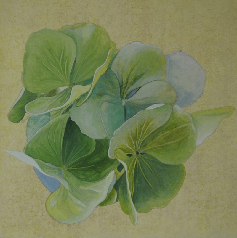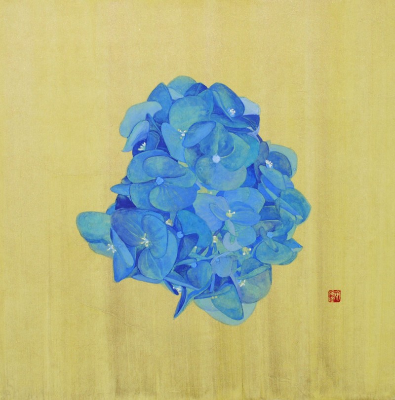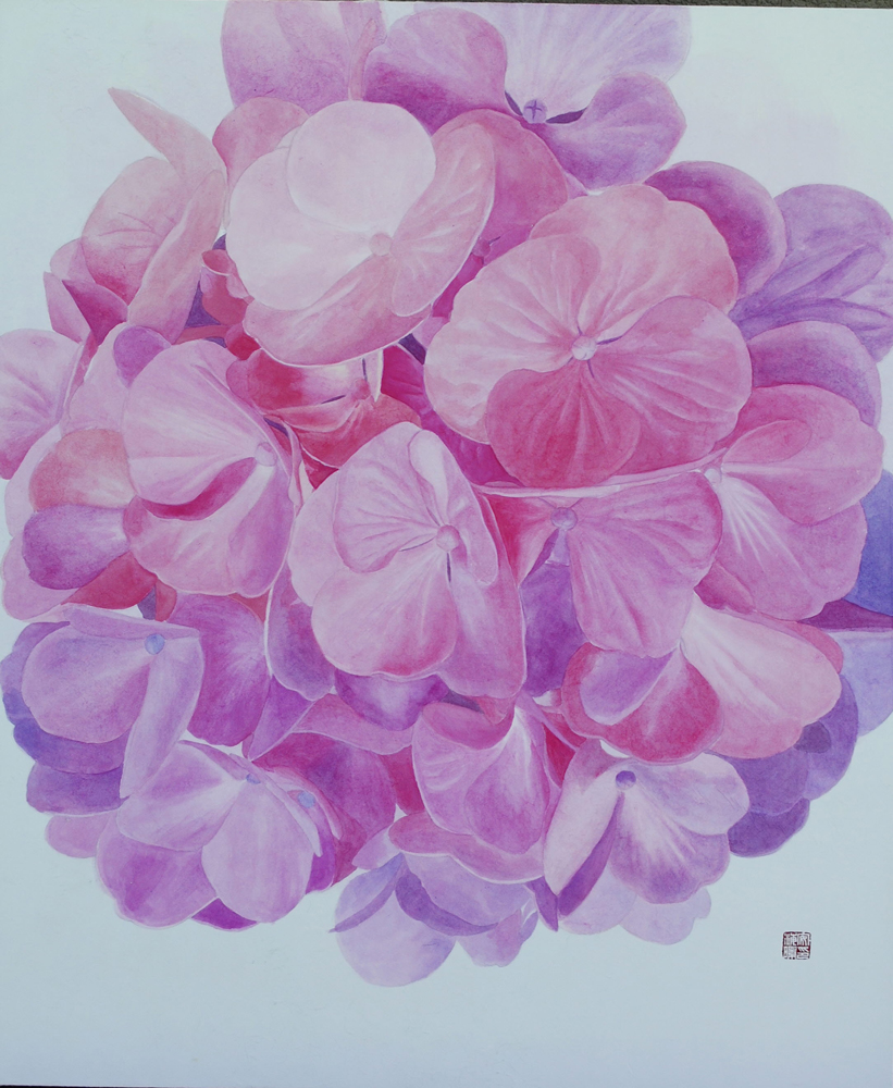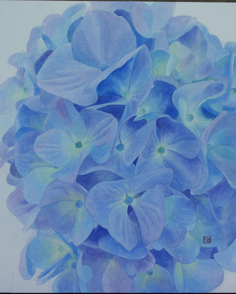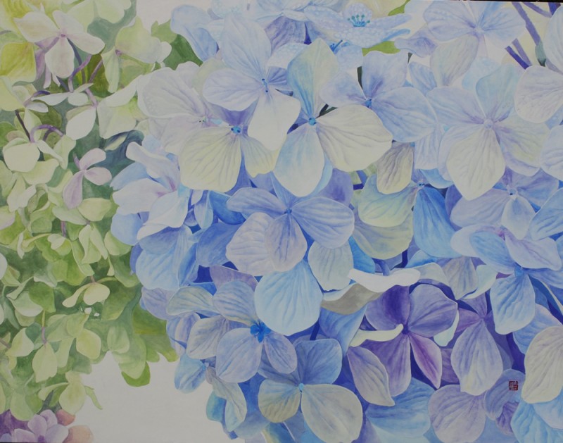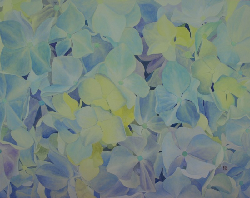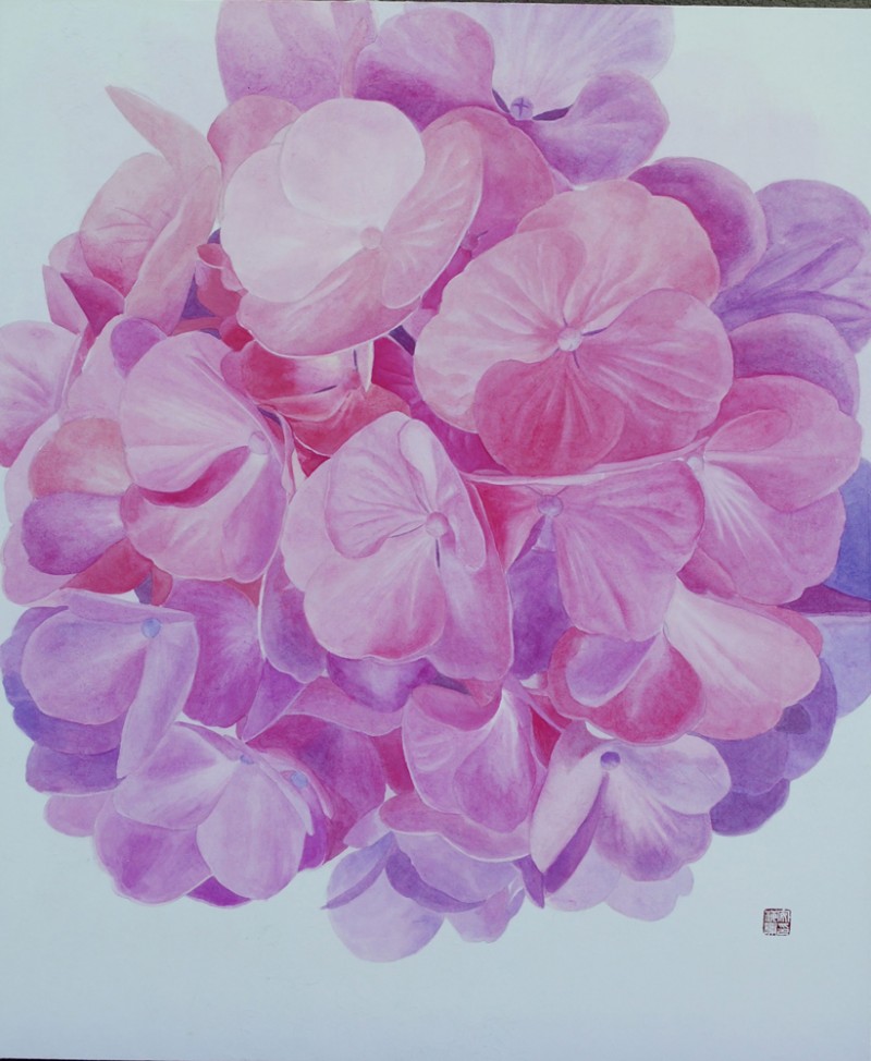 수국은 작은 꽃들이 모여 큰 한송이를 피운다. 땅의 성질과 만나 붉은 수국이 되기도 하고 파란 수국이 되기도 한다. 수국에서 보여지는 풍성함과 생동감, 시시각각 변화하는 색은 아름답기도 하지만 표현하는 데는 많은 어려움이 있다. 그 느낌과 다양성을 구현하기 위해 수십 번 보고 또 보는 과정을 거친다. 이러한 과정들은 고되지만 완성이라는 목표를 향해 쉼 없이 움직이는 의미 있는 일일 것이다. 2023.9 작가노트