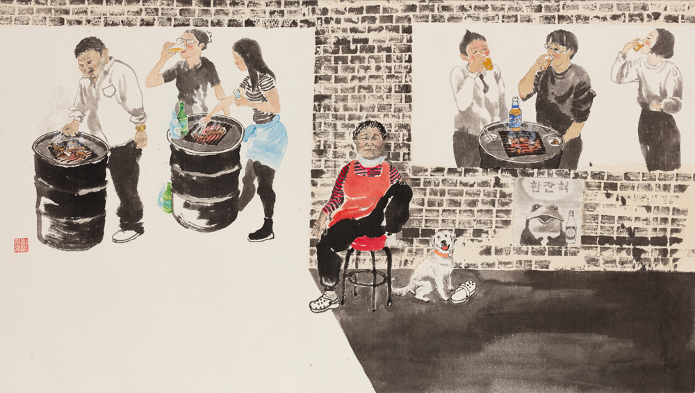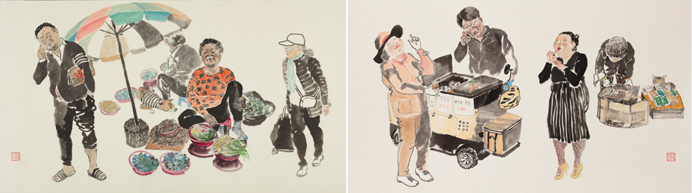 예술의 영역은 예술가만의 독점적인 소유물이 아니다. 예술가가 특별한 세상에서 고고하게 사는 것도 아니며, 일상과 멀리 떨어진 비속의 삶을 살면서 작품을 작업하는 것 또한 아니다. 화가의 예술 작업 과정과 결과물을 살펴보면, 예술적 표현에 있어서 표현 대상에 대한 화가의 조화된 감정은, 화가가 살아가는 일상의 생활에서 일어나는 구체적인 현상과 삶의 경험 및 개인의 성품 등과 밀접한 관련이 있다. 좀 더 구체적으로 들여다보면, 인간의 삶을 영위하는 시간이라는 개념의 경계는 낮과 밤, 그리고 사계절이 주기를 반복하여 나타나는데, 이 시간의 흐름 속에서 생활을 영위하는 것이 바로 일상이며, 이는 생생지락(生生之樂)의 자연성에 근거하는 것이다. 화가의 예술 작업 활동에 있어서, 화가의 일상의 사례들이 예술적인 의미를 지니기 위해서‘새로운 화의를 평범한 사례에서 찾았던’유협(유협(劉?).『문심조룡(文心雕龍) 26장』「신사(神思)」: 庸事或萌於新意.) 의 창작 생활처럼 일상생활에서의 관찰과 체험은 그 무엇보다 중요하다. 화가 또한 일상생활에서 친숙하고 새로운 것들이 예술적으로 승화되기 위해서는 반드시 신의(新意)가 필요한데, 이러한 창의력은 작가가 대상물의 내적 사유인 리(理)를 터득했을 때 성립되는 것이다. 그것은 대상의 외적 특징에서의 내적 본질의 리(理)를 터득했을 때 평범하고 반복적인 일상은 우리의 삶을 풍요롭게 만들어 주는 창조적 사고의 원천으로 작용한다는 점이다. 조선 후기 화가 강세황(姜世晃)은 김홍도(金弘道)의 그림을 평하면서“날마다 쓰는 말과 행동” (강세황(姜世晃).『표암유고(豹菴遺稿)』「단원기우일본(檀園記又一本)」: 人生日用百千云爲.) 이란 말로 김홍도 작품 세계의 신의(新意)가 일상에서 기인하고 있음을 밝힌바 있다. 강세황이 지적하고 있는 핵심에는 대부분 사람들이 생활에서 듣고 보아 온 것이기 때문에 식상하다고 느끼는 편견이 포함되어 있기는 하지만, 일상을 떼어놓고 화가의 예술 활동 및 작업에 대하여 말할 수 없다는 것을 우리에게 재확인시켜 주는 것이다. 이렇듯 일상생활이 개개인에게 중요한 것은 바로 자신의 성정(性情)에 의한 삶의 과정이기 때문이다. 그동안 일상생활의 소소한 여러 행동과 판단 등은 성정 발현의 과정으로 인식하지 못하고 단순한 습관과 인식으로만 간주했던 점을 바로 잡는데 이번 전시회의 작품 작업의 의의가 있다 하겠다. 나에게 있어서 일상은 자유 감성의 락(樂)을 체감하는 인간의 다변성의 세계를 대변해 주는 발현 및 현상인 것이다. 따라서 일상의 모든 행위와 그에 따라 발생되는 감정들은 모두 예술을 만들어 주는 소재이자 원천으로 여기고 있으며, 개인의 삶과 사소한 것에 즐거움을 느끼는 ‘해학(諧謔)적 일상’의 중요성에 대하여 표현하고자 하였다. 나의 작품 작업은, 현대 사회에서 자신에게 주어진 현실의 무게에서 벗어나게 해주고, 인간의 순수한 성정(性情)을 회복할 수 있는 해학적 즐거움을 추구하는 인간상의 다양한 모습들에 대한 작업으로서, 퇴근 후 딱 한 잔만으로 시작하는 소소한 모임, 혹은 혼자만의 혼술, 더불어 함께 하나 각자 깨달음 얻는 요가 하는 사람들, 재래시장에서의 쇼핑의 즐거움, 겨울나기를 준비하는 김장하는 주부, 사교댄스에서의 열정적 행위, 공유의 즐거움으로 어깨를 들썩이게 만드는 춤사위, 희로애락이 넘치는 화투치기, 애견 산책시키기, 등등, 개인이 살아가는 여러 형태의 삶에 대하여 나의 주관적 경험과 해석을 재구성하여 다른 사람들과 공감대를 형성할 수 있는 작품으로 완성시키고자 하였다. 각 작품에서 표현된 인물들의 모습에서는 ‘순수성’과 ‘천진성’을 제시하였는데, 이 개념은 현실의 이해타산에서 벗어났을 때 자연스럽게 우러나오는 여유와 즐거움으로 인하여 작품에서 표현된 인물 개개인의 가치를 극대화 시키고, 사람들의 삶에 가치를 부여하는 역할을 해주었다. 표현 방법에 있어서는, 대체적으로 가늘고 부드러운 선 보다는 두꺼운 평필(評筆)을 이용해서 부피감을 갖는 발묵법(潑墨法)과 파묵법(破墨法)을 사용하여 단순한 필획으로써 억지로 의도하지 않은 자연스러운 개개인의 해방감을 표현하기도 하였다. 담묵(淡墨)과 농묵(濃墨)의 발묵 대비를 이용해 대상이 지닌 고유한 성정의 발현이 어떠한 움직임으로 이어지는 가를 전달하고자 하였다. 거침없는 자유로운 표현의 행위의 효과는 차가운 일상생활에서의 인물의 조화를 추구하는 따스한 성정의 감정의 발현이기도 하고, 그러한 행위를 통해 이열성정(怡悅性情)의 감정 해소의 즐거움에 몰두하기도 하였다. 특히 작품에 반영된 일상은 요즘 같은 팬더믹의 시대에 일상에 위협받는 일이 생긴다 할지라도 자연의 이치에 의해 삶을 회복하려는 움직임이 일어난다는 것을 전달하고 싶었다. 그러한 본능적 움직임 속에서 인생을 살면서 곱씹게 되는 ‘사는 맛’을 느끼며 현대 사회의 인간상과 즐거움을 추구하려는 무한한 긍정적인 힘을 발견 할 수 있었다.